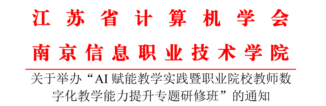 培训通知|AI 赋能教学实践暨职业院校教师数字化教学能力提升专题研修班![]() 通知 各有关单位: 随着数字经济与教育数字化的深度融合,全民数字素养与技能的提升已成为国家发展的重要基石。为深入贯彻落实党的二十大精神,落实国家教育数字化战略行动、《教育部关于推进教育数字化战略行动的意见》等文件精神,扎实,高质量、深层次、全方位地推动职业教育数字化转型工作。促进信息技术与教育教学的深度融合创新,积极探索智慧课堂环境下的教学变革,提升教师的数字素养与技能,推动教学方法的革新与升级,促进优质教学资源的应用与共享,赋能课堂减负增效,全面提高教育教学质量 。经研究决定举办"AI赋能教学实践暨职业院校教师数字化教学能力提升专题研修班"。通过系统的学习和实践,帮助教师更好地掌握数字技术在教学中的应用,提升教学设计与实施能力。研修结束后,将颁发结业证书。请各单位积极组织相关人员参加研修班,共同推动职业教育数字化转型与教学质量提升。具体如下: 一、举办单位 指导单位 江苏省计算机学会 主办单位 江苏省计算机学会职业教育产教融合专家委员会 江苏省计算机学会网络空间安全职业教育专业委员会 长三角人工智能产教联盟 承办单位 南京信息职业技术学院 支持单位 科大讯飞股份有限公司 南京米好信息安全有限公司 二、研修内容 以新一代数字技术和人工智能技术为核心驱动力,通过人工智能辅助项目化教学的创新模式,实现技术与教育教学的无缝对接与深度融合。